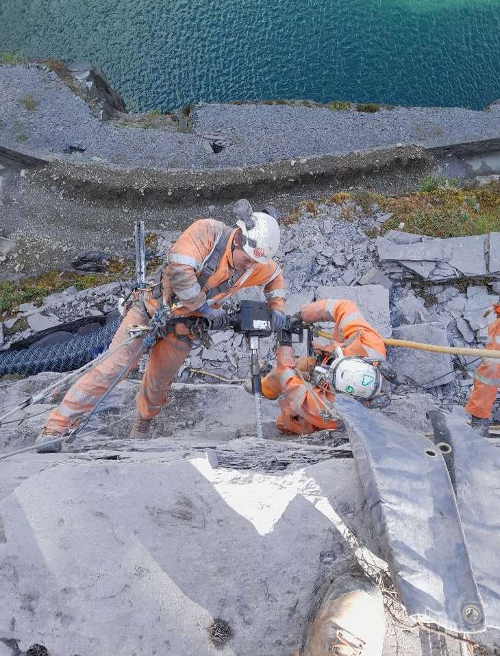 Roedd llawer iawn o gerrig rhydd a llac yn bresennol ar draws yr ardal yr effeithiwyd arni. Gweithiodd technegwyr mynediad rhaffau Griffiths yn drefnus o’r brig i lawr, gan dynnu deunyddiau rhydd yn systematig, gyda slabiau unigol o graig yn pwyso hyd at 3T yn cael eu tynnu.
