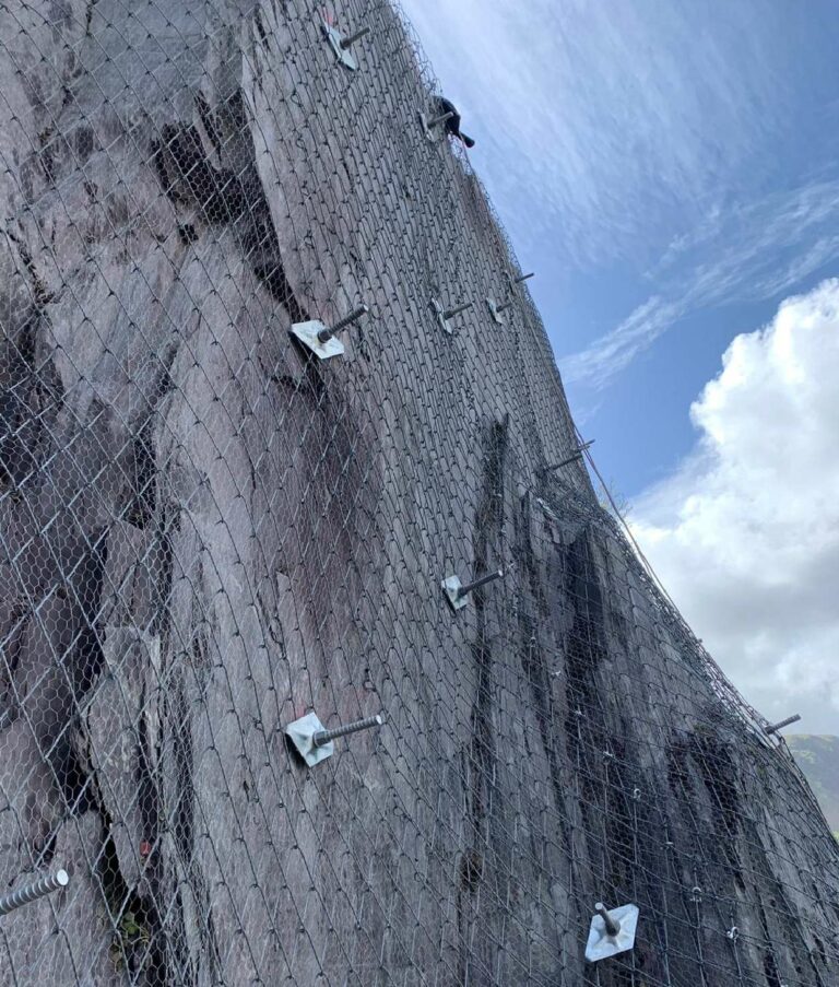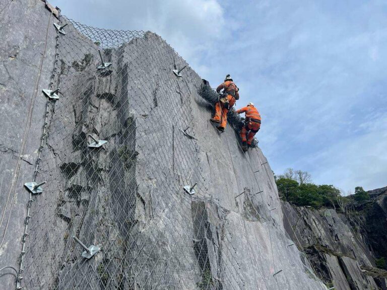 Gosod 225m2 o rwyll corryn ucheldynnol, trwm gyda haen waelodol o rwyll â thyllau mân, y cyfan wedi’i ddiogelu gan folltau craig dur 37Dr 3m o hyd diamedr 32mm wedi’u cau mewn twll 41mm gan ddefnyddio resin Lockset.